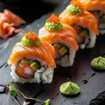 A simple and elegant sushi roll featuring fresh salmon and avocado, perfect for impressing guests without spending hours in the kitchen.