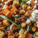 A healthy and flavorful bowl featuring roasted sweet potatoes, crispy chickpeas, and a creamy tahini yogurt sauce.