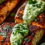 - Once the salmon is done, remove it from the oven and drizzle the avocado lime sauce over the top.