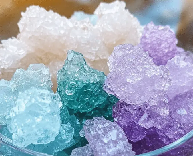 While these crystals are not edible, their appearance is enchanting and magical. They resemble frosted glass or rock candy, with sharp, clear structures that catch the light beautifully. If you use colorful pipe cleaners underneath, the crystals will take on soft hues of blue, pink, green, or whatever color you chose. The textures range from fine dusting to large, sharp facets, giving the finished product a gemstone-like finish. Whether you hang them on a holiday tree or place them on a shelf, they add a sparkly, handmade charm to any space.