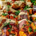 A quick and delicious meal featuring roasted sweet potatoes, perfectly cooked chicken, and a creamy sauce. Ideal for meal prep and flexible for variations.