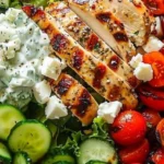Delicious Greek Chicken Bowls featuring grilled chicken, fresh vegetables, and a tangy tzatziki sauce, all served over a bed of rice or quinoa.